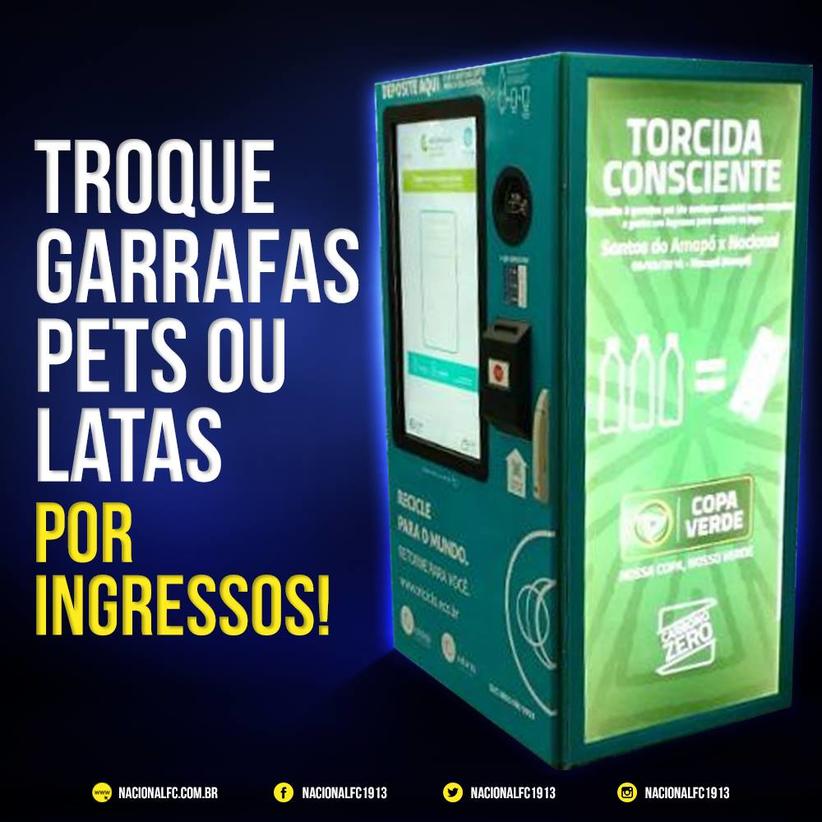 A campanha da Confederação Brasileira de Futebol (CBF), “Torcida consciente”, está a todo vapor. Os torcedores amazonenses que quiserem vibrar pelo Nacional Futebol Clube, único representante do estado do Amazonas na Copa Verde, poderão ter ingressos grátis, basta trocar três unidades de garrafas pets ou três latas por um voucher que dá direito a um ingresso.