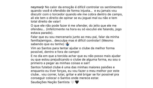 “No calor da emoção é difícil controlar os sentimentos quando você é ofendido de forma injusta”, escreveu Neymar. Ele afirmou aceitar críticas sobre seu desempenho em campo, mas não tolera ataques pessoais. “Falar que sou mercenário junto ao meu pai, falar da minha família... desculpa, mas é difícil controlar”, completou.