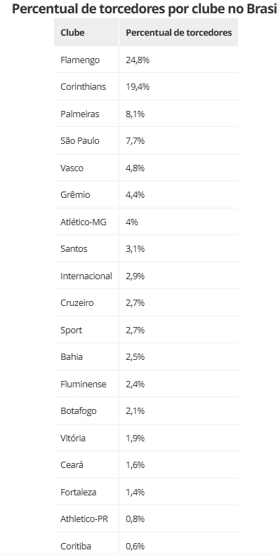 O Flamengo lidera com 24,8% da torcida nacional, seguido pelo Corinthians, com 19,4%. Palmeiras (8,1%) e São Paulo (7,7%) aparecem logo atrás, tecnicamente empatados. Vasco (4,8%), Grêmio (4,4%) e Atlético-MG (4%) formam o segundo pelotão, enquanto Santos, Internacional e Cruzeiro/Sport completam o top 10.