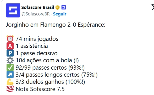 De acordo com dados do Sofascore, Jorginho teve 104 ações com a bola, registrou 93% de acerto nos passes (92 em 99 tentativas), acertou 75% dos lançamentos longos (3 de 4), venceu todos os duelos disputados (3/3) e ainda contribuiu com um passe decisivo.