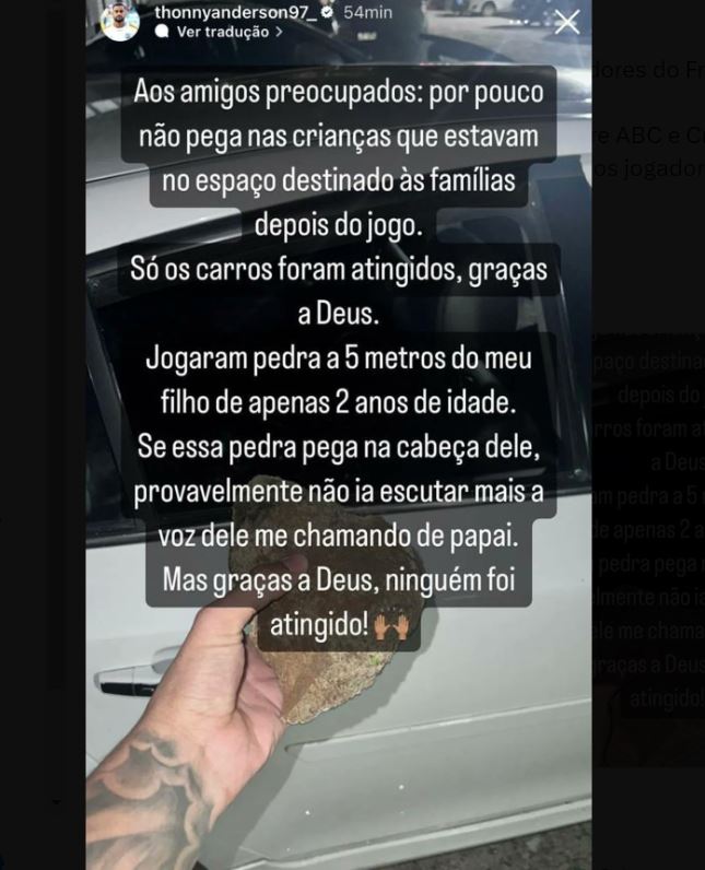 Em seu perfil no Instagram, Thonny contou que por pouco o filho dele, de 2 anos, não foi atingido por uma das pedras lançadas na área reservada para as famílias dos jogadores durante uma tentativa de invasão dos torcedores ao local.