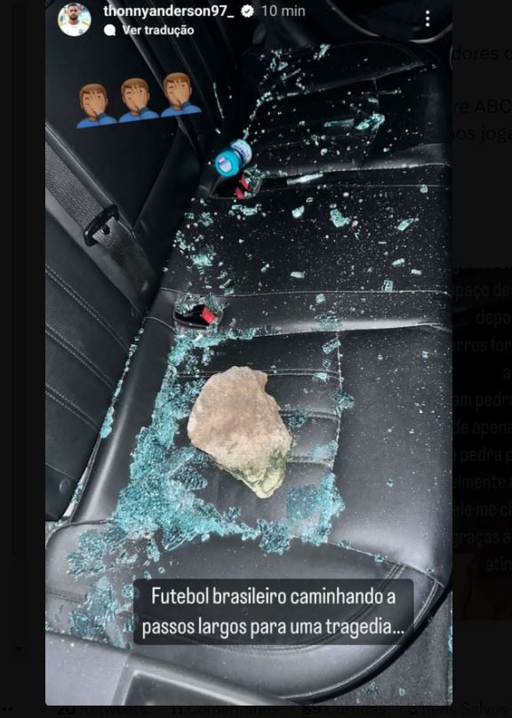 Thonny ainda mostrou fotos de como ficou o carro e mostrou as pedras na parte interna do automóvel. Na legenda ele lamentou: “Futebol brasileiro caminhando a passos largos para uma tragédia…”.