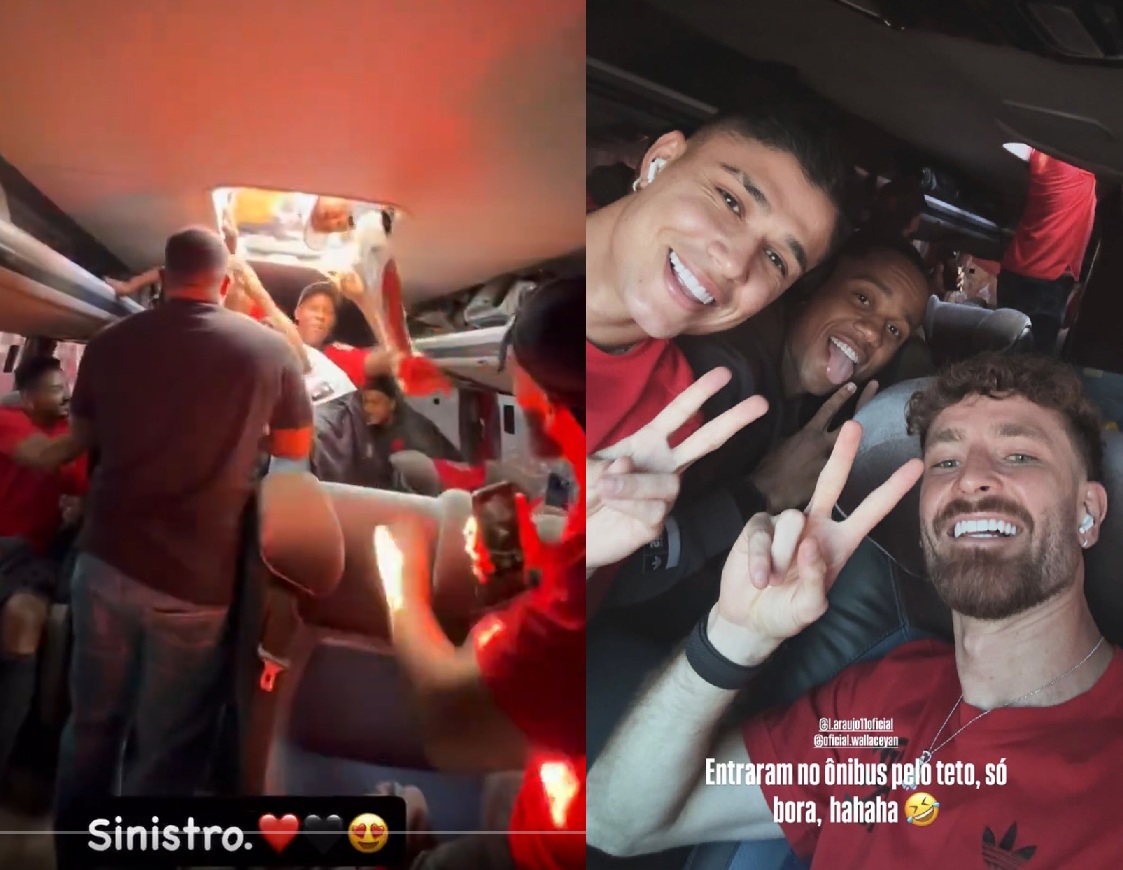 A chegada do Flamengo ao Aeroporto do Galeão, na tarde desta quarta-feira (26), foi marcada por uma cena inusitada: torcedores subiram no teto e chegaram a entrar no ônibus da delegação pela saída de emergência. Jogadores registraram o momento nas redes sociais, mostrando pelo menos dez torcedores dentro do veículo.