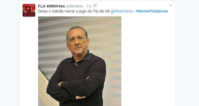 Os flamenguistas se uniram e criaram uma grande movimentação nas redes sociais nesta quinta-feira (23). Com a hashtag “NarraOFlaGalvao”, torcedores pediram que Galvão Bueno narre o jogo de estreia do Rubro-negro na Copa Libertadores da América contra o San Lorenzo, no próximo dia 8.