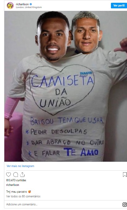 Na publicação, Richarlison aparece ao lado de Magalhães, adotando a famosa pose do meme, e escreveu na legenda: "TMJ (Tamo Junto), meu parceiro", sinalizando uma mensagem de união e superação do desentendimento.