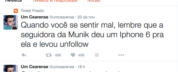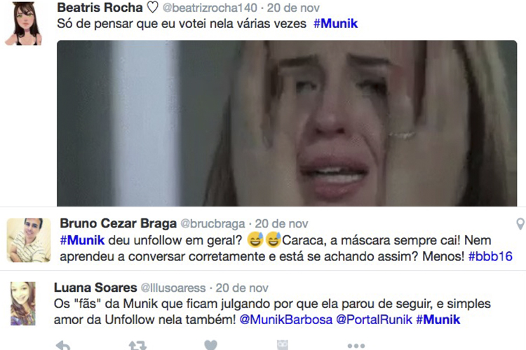 Neste domingo (20), Munik ironizou em resposta a uma internauta que a chamou de ingrata. “@MunikBarbosa querida foram essas pessoas que você deu unfollow e outras mais que te deram o premio ingratidão é o que te define”.