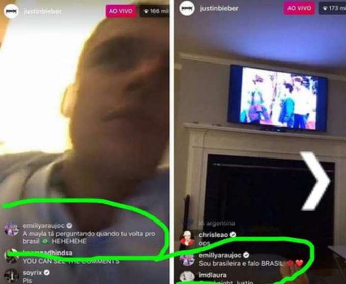 “Oi, Justin! A Mayla está só de olho aqui”, disse Emilly. “A Mayla está perguntando quando tu volta para o Brasil”, continuou. “Sou brasileira e falo do Brasil”, escreveu de novo.