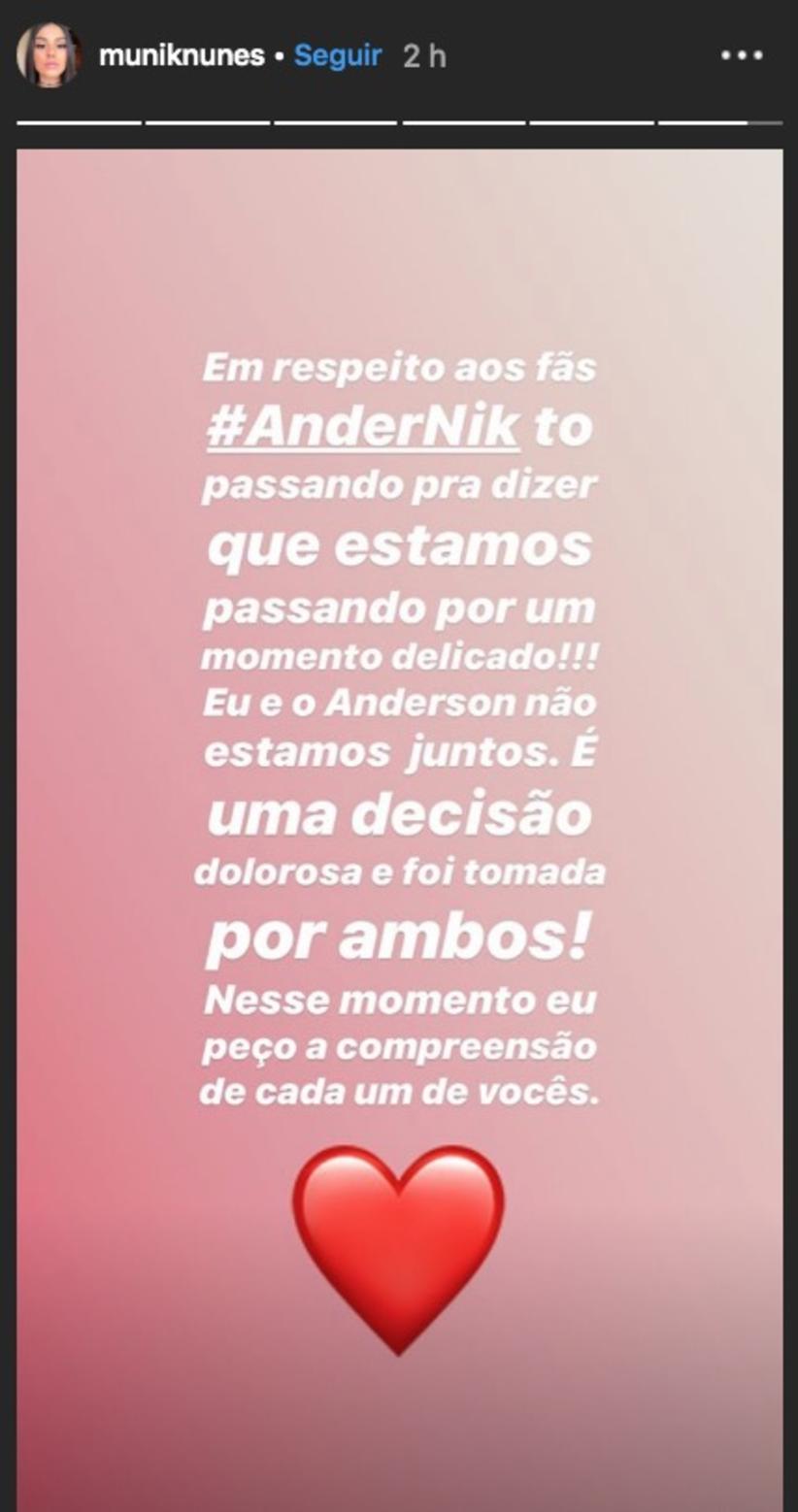 Munik Nunes, que participou do 'Power Couple' em 2018 com o marido Anderson Felício, anunciou a separação do empresário nesta sexta-feira (23), via Instagram.