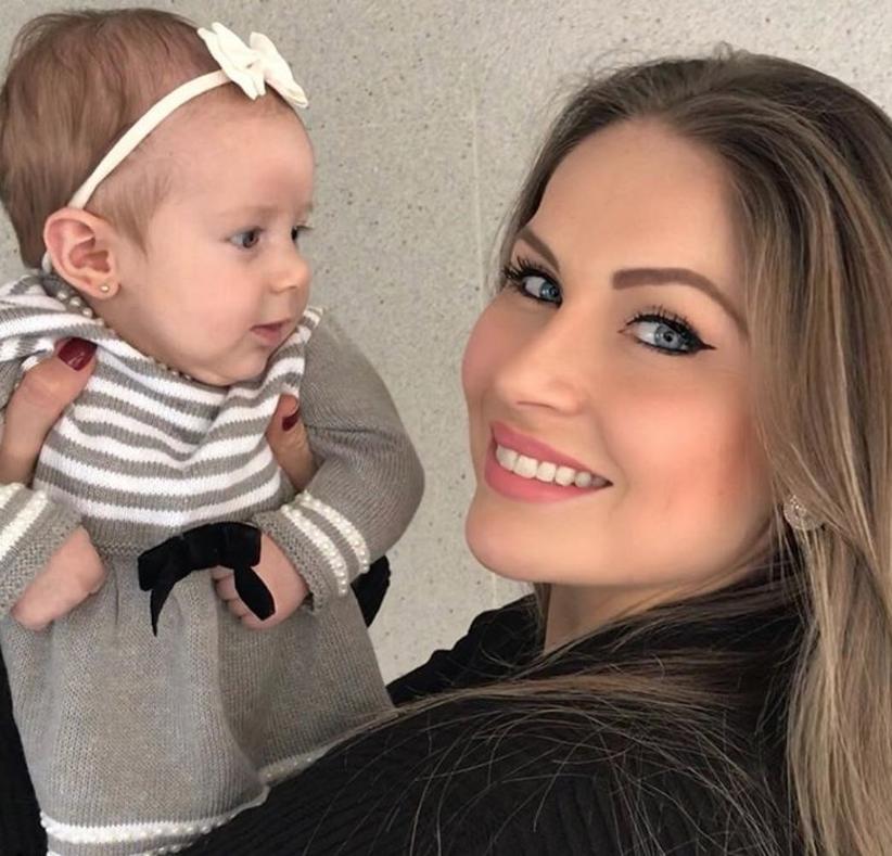 "3 meses pós-parto! Alguns quilos mais pesada, a barriguinha mais flácida, mas não me importo! Tenho orgulho do meu corpo que gerou uma vida. O melhor presente q Deus podia me dar está deitadinha naquele berço ali! Agora voltei às atividades físicas e minha meta é perder 8kgs! Sem pressa e sem cobrança! Ser mãe é mais importante do que qualquer corpo definido e está em primeiro lugar. Mas pretendo atingir meus objetivos e ser uma mamãe sarada! Rs Então vamos à luta", disse.