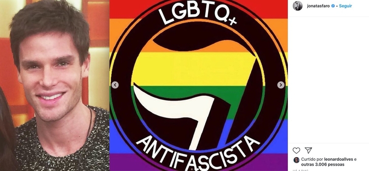 O ator Jonatas Faro, ex-marido de Danielle Winits, fez um post sobre o movimento antifascista e intrigou os internautas ao publicar “LGBTQ+ Antifacista”.
