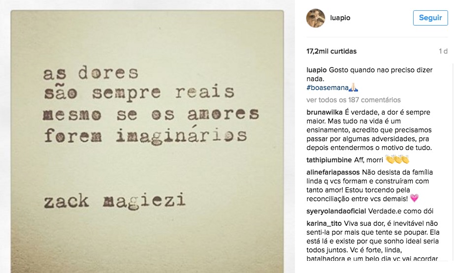 “As dores são sempre reais, mesmo se os amores forem imaginários”, dizia a mensagem de Luana com a legenda: “Gosto quando não preciso dizer nada”. Scooby então respondeu: “concordo, Luana Piovani”.