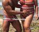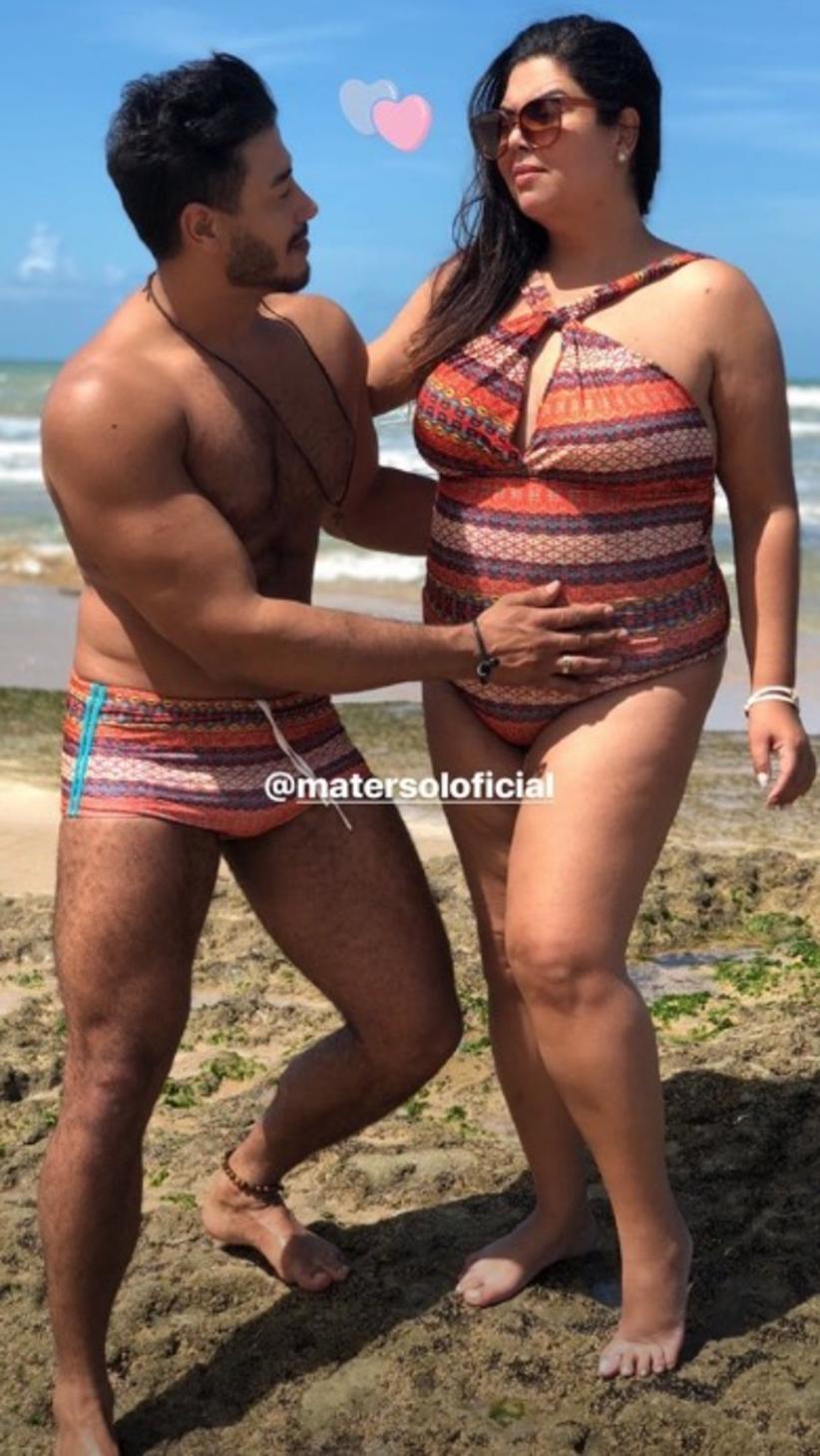 Uma das fotos mostra que Fabiana e o namorado já estão até combinando as roupas, usando a mesma estampa de maiô e sunga.