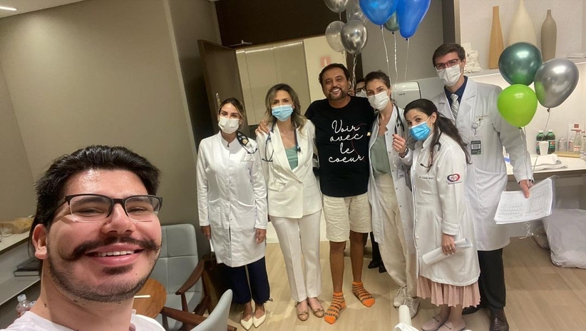 O apresentador comemorou neste domingo (21) a recuperação, com fotos ao lado da equipe médica e do seu filho, João Pedro, de 20 anos, que acompanhou tudo de perto.