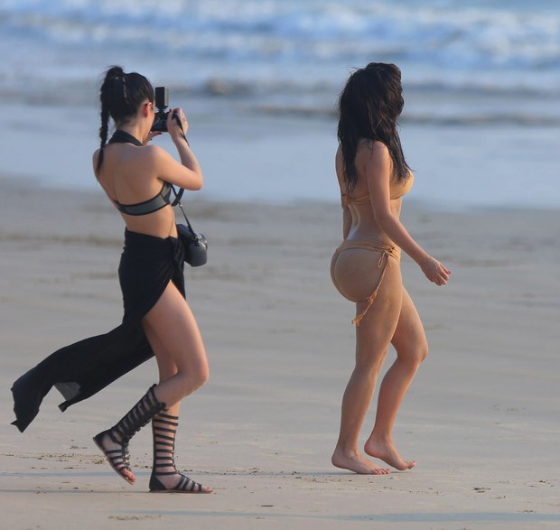 Durante um ensaio, Kim chamou atenção pelo tamanho de seu bumbum enquanto sensualizava na areia.