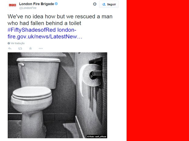 Campanha 'Ciquenta tons de vermelho' do corpo de bombeiros de Londres: 'Não temos ideia de como resgatamos um homem que tinha caído atrás do vaso'.