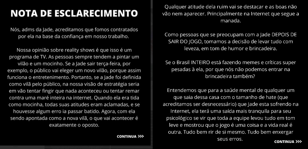 Leo afirmou que estava insatisfeito e não concordava com os posicionamentos que os ADMs vêm tendo nos últimos dias. Alguns fãs se surpreenderam quando o perfil oficial de Jade foi trocado para “Jade Píton”, embarcando nos memes que chamam a sister de cobra e de vilã. Além disso, os adms chegaram a compartilhar um áudio íntimo que vazou da sister com dor de barriga no banheiro privativo do BBB22. Veja a explicação da equipe: