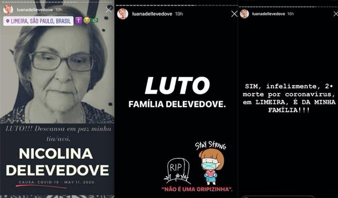 “Luto, descansa em paz, minha tia-avó. Sim, infelizmente a 2ª morte por coronavírus em Limeira (SP) é da minha família”, escreveu ela. Em seguida, ela fez um apelo para que os 'governantes' respeitem as vítimas do coronavírus.