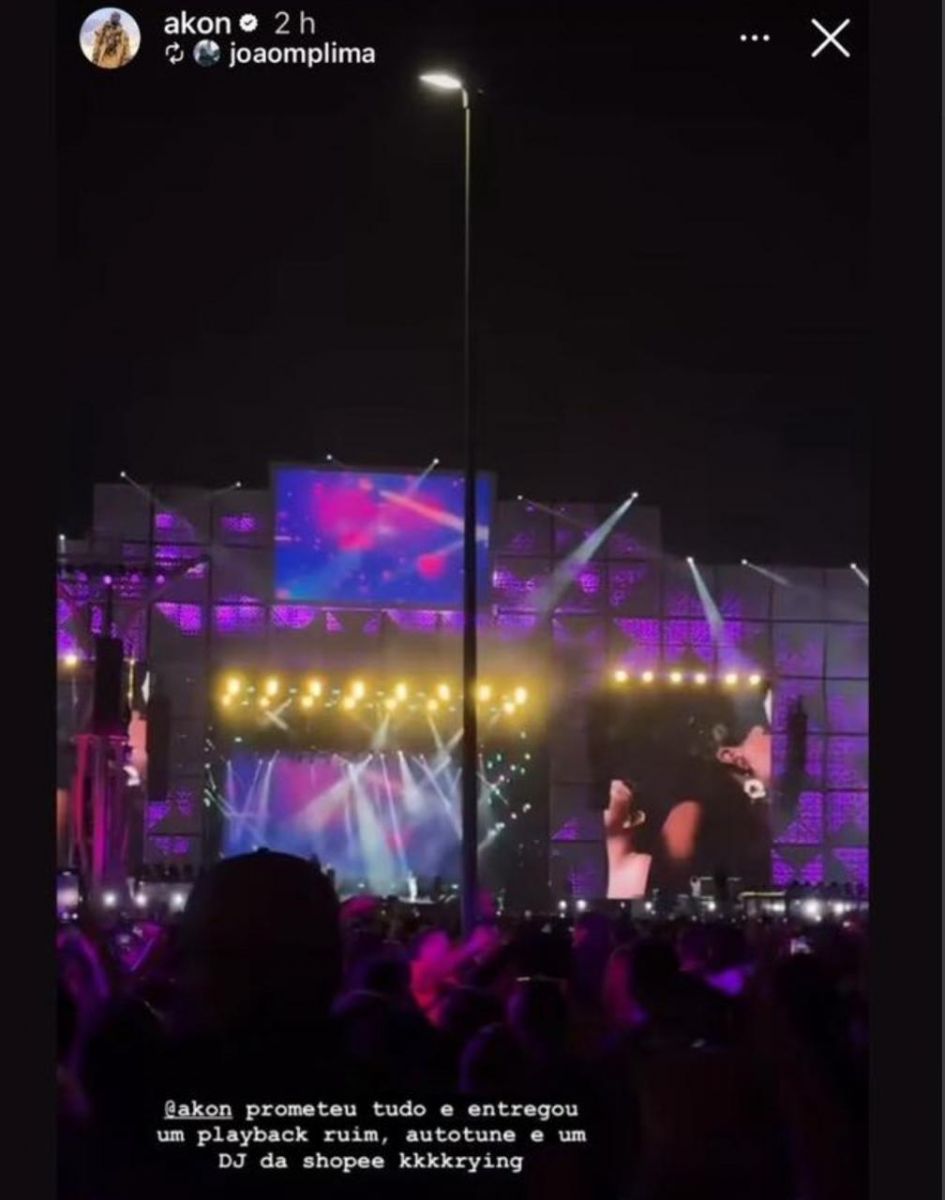 Pois bem, Akon republicou vários stories mostrando a apresentação, inclusive, um em que o internauta o critica. "Akon prometeu tudo e entregou um playback ruim, autotune e um DJ da Shopee", escreveu o internauta.
