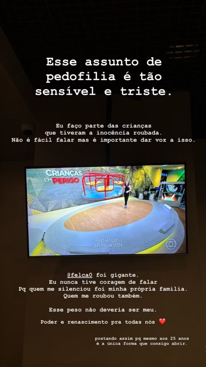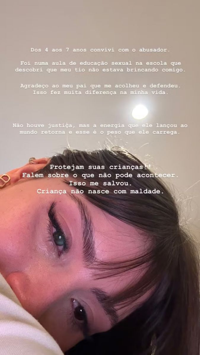 Ela relatou que descobriu o abuso durante uma aula de educação sexual, pois até então, pensava que o tio estava apenas "brincando" com ela. Por isso, a influenciadora fez um apelo para que pais e responsáveis protejam suas crianças, ensinando-as sobre o que não é permitido. "Protejam suas crianças! Falem sobre o que não pode acontecer. Isso me salvou. Criança não nasce com maldade."