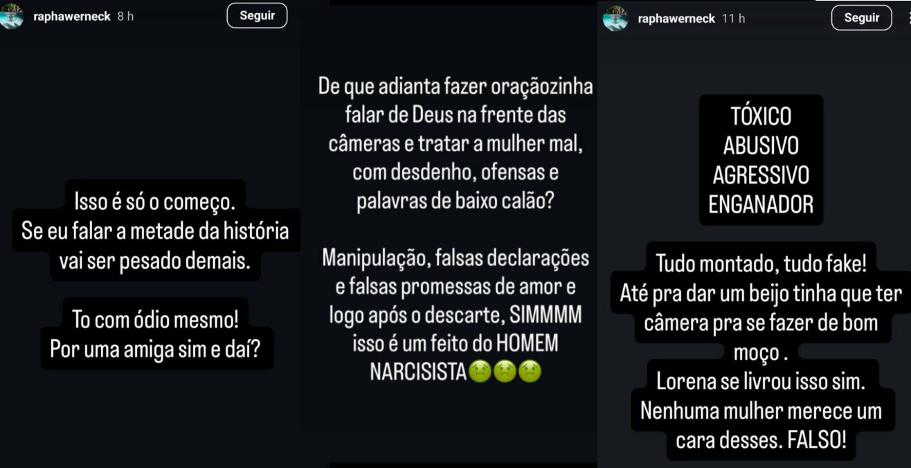 Por fim, Rapha deu a entender que ainda existem mais fatos não revelados sobre a relação e justificou seu posicionamento. “Isso é só o começo. Se eu falar a metade da história vai ser pesado demais. Tô com ódio mesmo! Por uma amiga, sim, e daí?”, disparou.