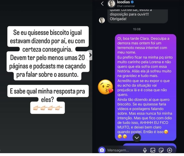 Em suas redes sociais, o amigo compartilhou um print de uma conversa mostrando que foi sondado pela equipe do Portal Leo Dias para uma entrevista. Ele respondeu com um longo texto, afirmando que prefere "ficar na sua", pois Lorena "já sofreu muito na gravidez e tudo mais". Segundo ele, expor suas opiniões agora poderia prejudicá-la, algo que não deseja.