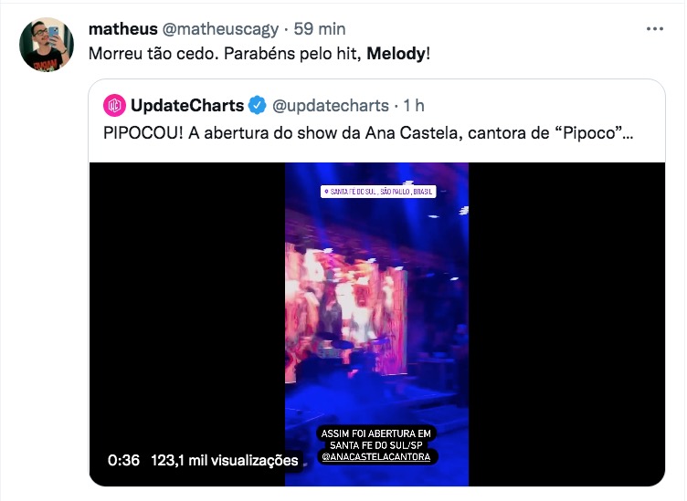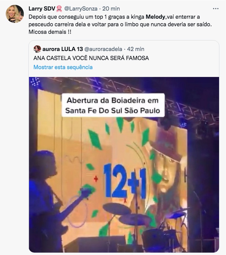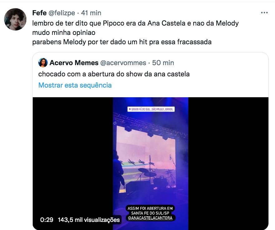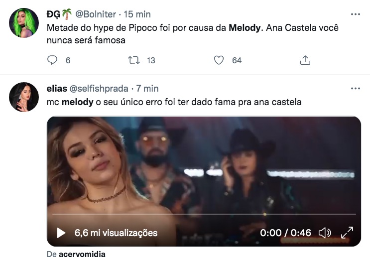 Os internautas criticaram a cantora. “Metade do hype de Pipoco foi por causa da Melody. Ana Castela você nunca será famosa”, decretou uma seguidora.