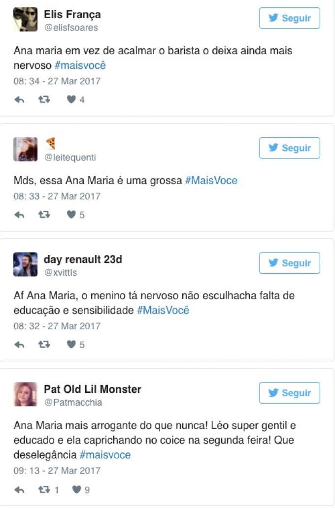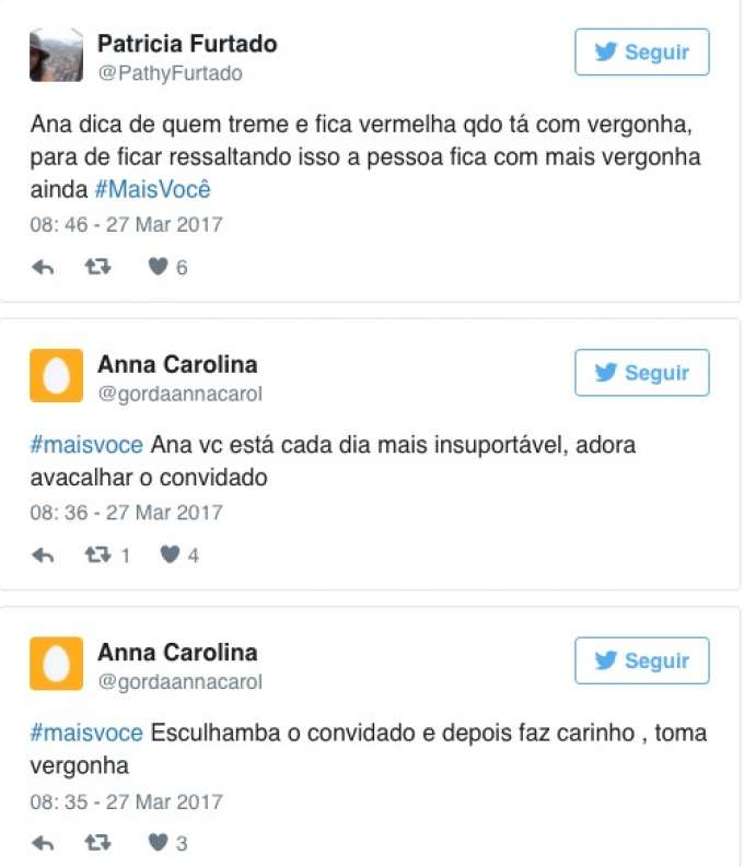 Nas redes sociais, os internautas criticaram a postura da apresentadora. “Ana vc está cada dia mais insuportável, adora avacalhar o convidado”, detonou uma internauta. “Mds, essa Ana Maria é uma grossa”, criticou outra pessoa.