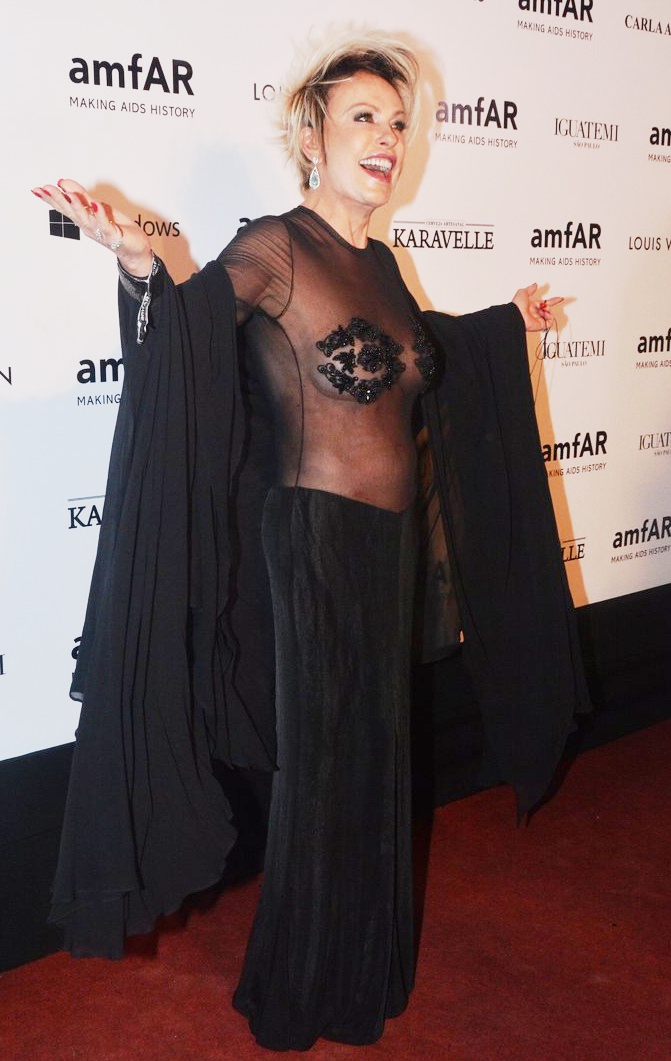Ana Maria Braga resolveu ser o centro das atenções durante a noite da sexta-feira, no Baile de Gala da AmFar, em Sào Paulo, que reune diversos famosos nacionais e internacionais.