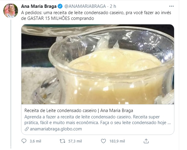 Ana Maria Braga comentou o assunto mais citado do dia: o gasto de mais de R$ 15 milhões com leite condensado pela gestão Jair Bolsonaro. A apresentadora usou o Twitter para compartilhar uma receita caseira do doce.