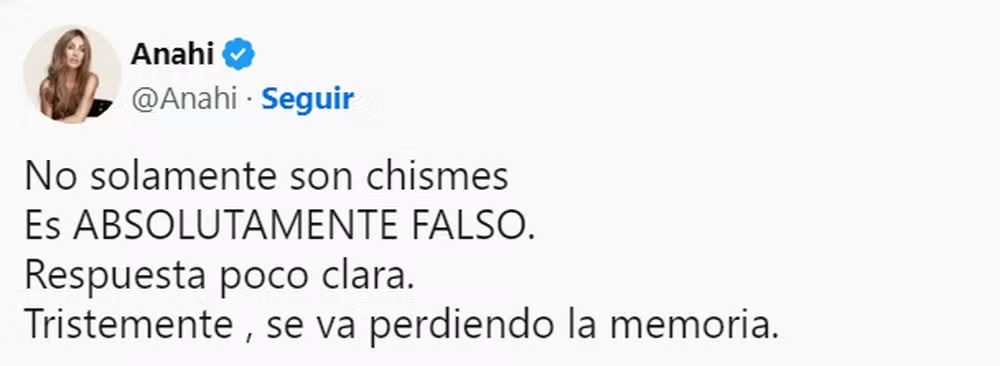 Apesar de Christian não ter entrado em detalhes, Anahí não gostou do fato do então amigo não ter dado fim aos boatos. “Não se trata apenas de fofoca. É absolutamente falso. [Foi uma] resposta pouco clara. Infelizmente, a memória vai se perdendo”, escreveu ela na rede social X.