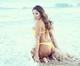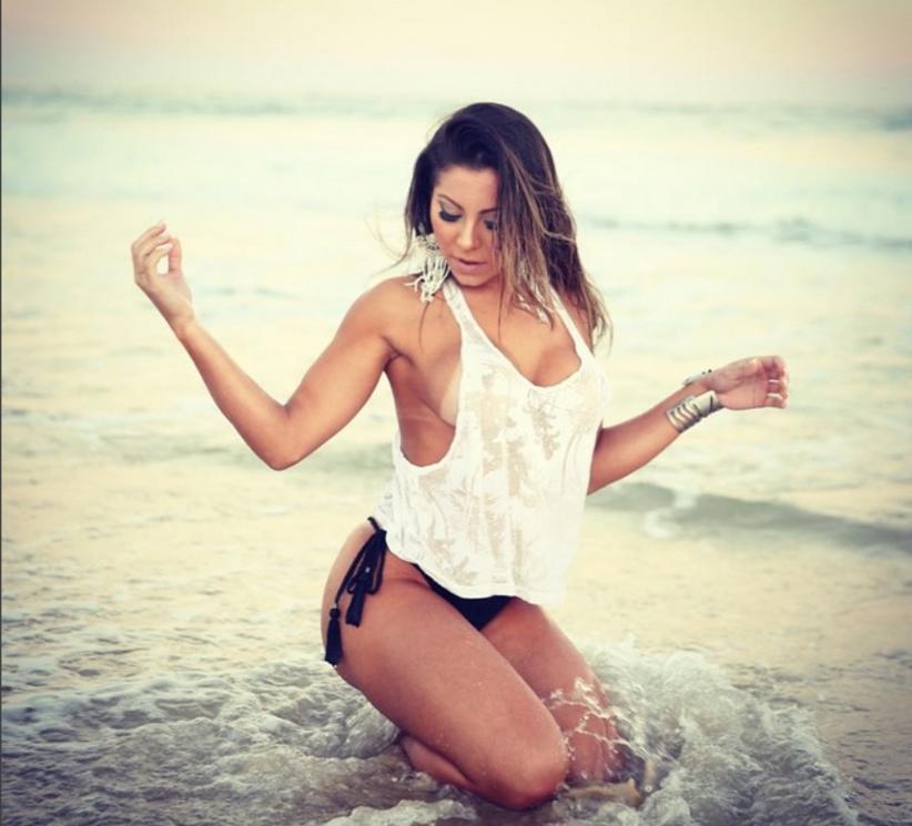 Sem a parte de cima biquíni, a modelo deixou os seios fartos e a marquinha do biquíni em evidência. A morena recebeu vários elogios dos marmanjos de plantão.