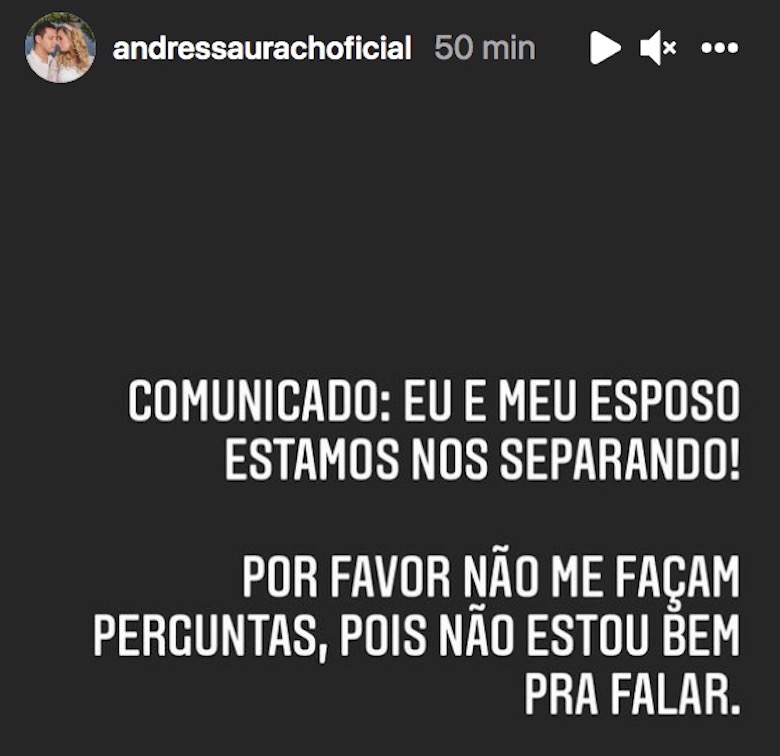 “Eu e meu esposo estamos nos separando! Por favor não me façam perguntas, pois não estou bem pra falar”, escreveu no stories do Instagram.