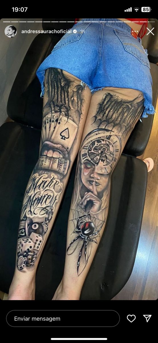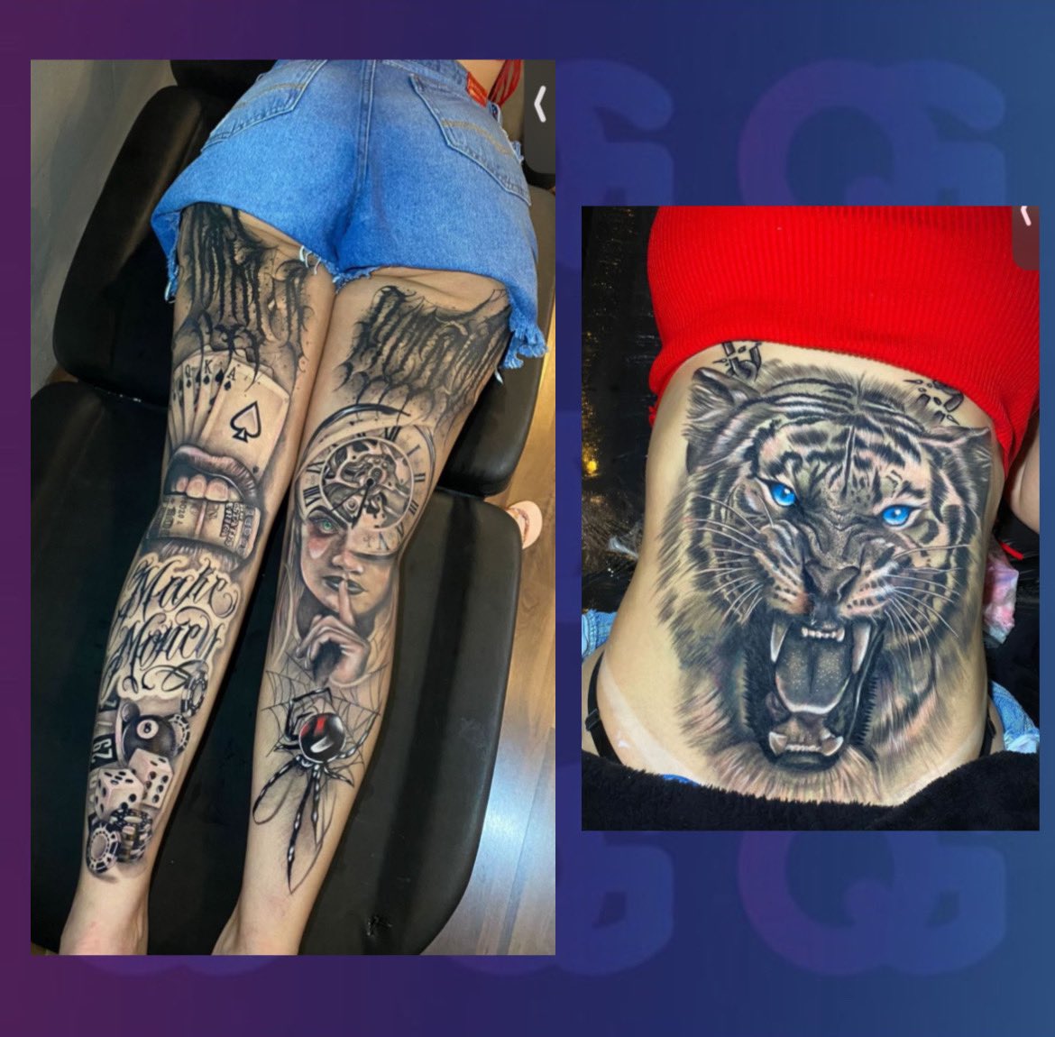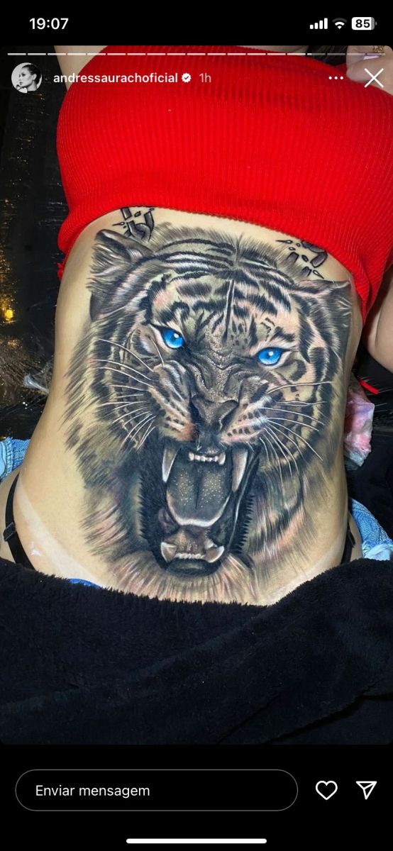 A musa do Privacy cobriu completamente a barriga com uma tattoo de leão em preto e branco, apenas com os olhos azuis, e também deixou as duas pernas completamente cobertas com outro desenho, na parte de trás.