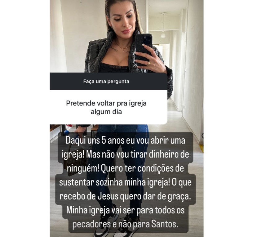 Andressa Urach afirmou em interação com os seguidores no Instagram que tem o desejo de abrir uma igreja futuramente.