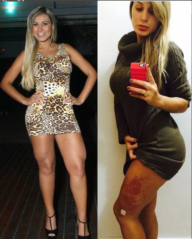 Há cinco anos, a ex vice-miss bumbum implantou hidrogel - um líquido usado para preencher rugas - em suas coxas para que as mesmas ficassem definidas, mas a loira começou a sentir dor no local.