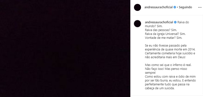 Andressa Urach fez um post preocupante neste sábado (25), no Instagram. No desabafo, a modelo postou uma imagem da cor preta e escreveu: