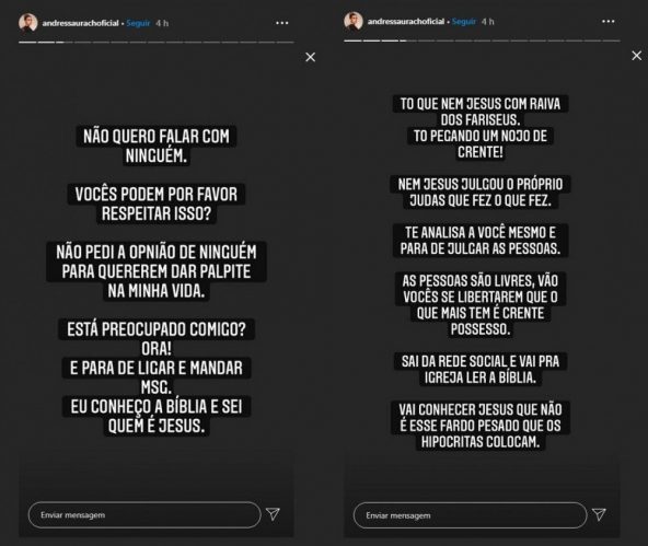 Depois de fazer desabafos contra a Igreja Universal, Andressa Urach usou as redes sociais para deixar claro que não quer saber de ninguém da igreja indo atrás dela para dar palpite em sua vida.
