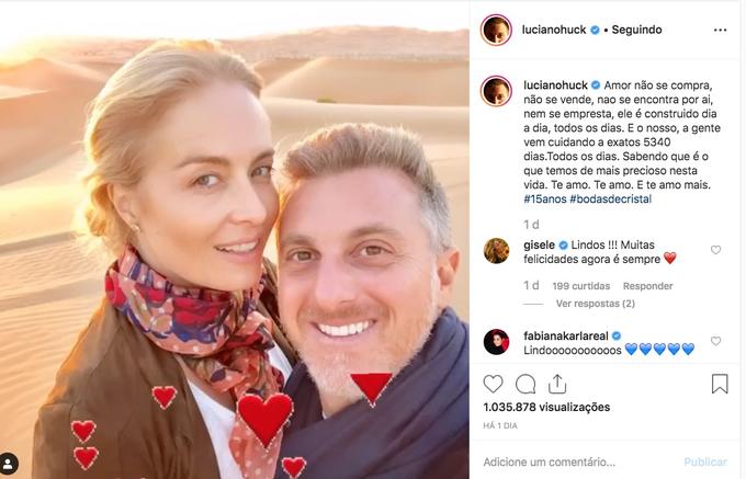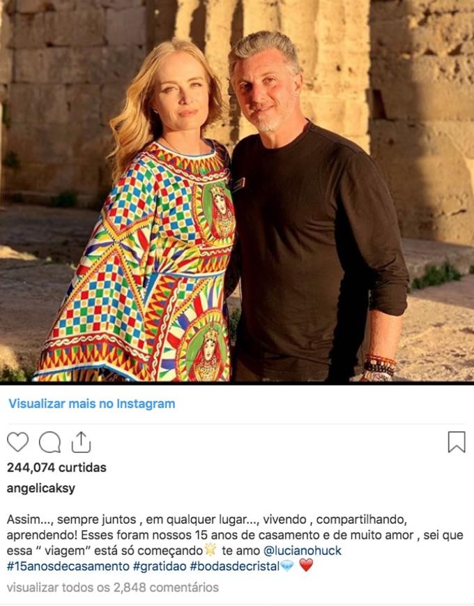 Luciano Huck e Angélica celebraram o amor nesta quarta-feira, 30, quando fizeram bodas de cristal. O casal, hoje com três filhos, completou 15 anos de casamento e fizeram declarações nas redes sociais. Eles se casaram em 2004 no Rio de Janeiro em uma festa repleta de personalidades.