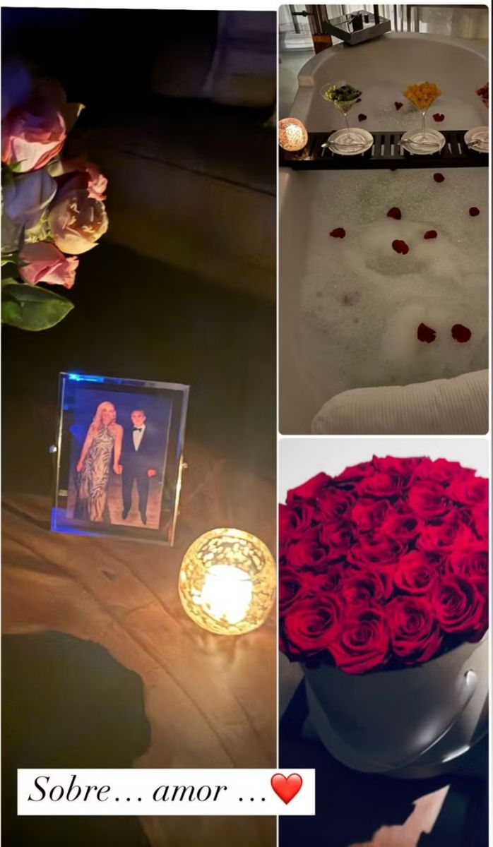 Nesta sexta-feira (13) a apresentadora de 51 anos mostrou detalhes do cenário onde passou a noite com o apresentador, de 53. Uma banheira com pétalas de rosas, à luz de velas, com taças com frutas e um porta-retrato com uma foto dos dois. “Sobre... amor...”, escreveu ela, que também mostrou a vista para uma praia no Rio de Janeiro.