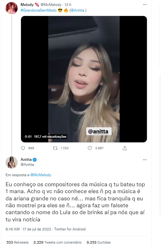 Entenda - Tudo começou com Anitta se defendendo das críticas após afirmar que não é petista nas redes sociais, embora esteja apoiando Lula nestas eleições. Quando rebatia uma internauta sobre a questão “falem bem ou falem mal, mas falem de mim”, Anitta citou Melody e afirmou que “nada que ela faz é de fato sério e profissional, mas ela consegue ótimo engajamento e se manter no mercado por criar tretas brigando sozinha”.