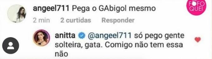 No instagram, uma seguidora pediu: "Pega o Gabigol mesmo". Anitta respondeu de forma bem direta: "Só pego gente solteira, gata. Comigo não tem essa não".