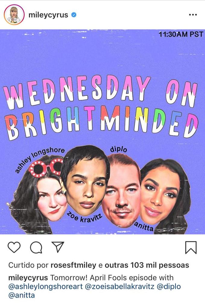 Em um dos stories, a funkeira compartilhou um post só de aniversariantes do mês de abril, de nada mais, nada menos que a cantora norte-americana Miley Cyrus. No post, Anitta aparece ao lado de artistas internacionais como o DJ Diplo, com quem já fez parceria, nos hits 'Sua Cara' e 'Make it hot'.