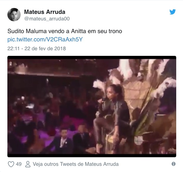 “Anitta sambando na cara do Maluma foi o melhor da noite”, disse uma internauta. “O trono da Anitta parou em frente a mesa do Maluma”, debochou outro. “Gente a Anitta é muito afrontosa bixo, desceu do trono bem na frente do maluma kkk”, escreveu outra.