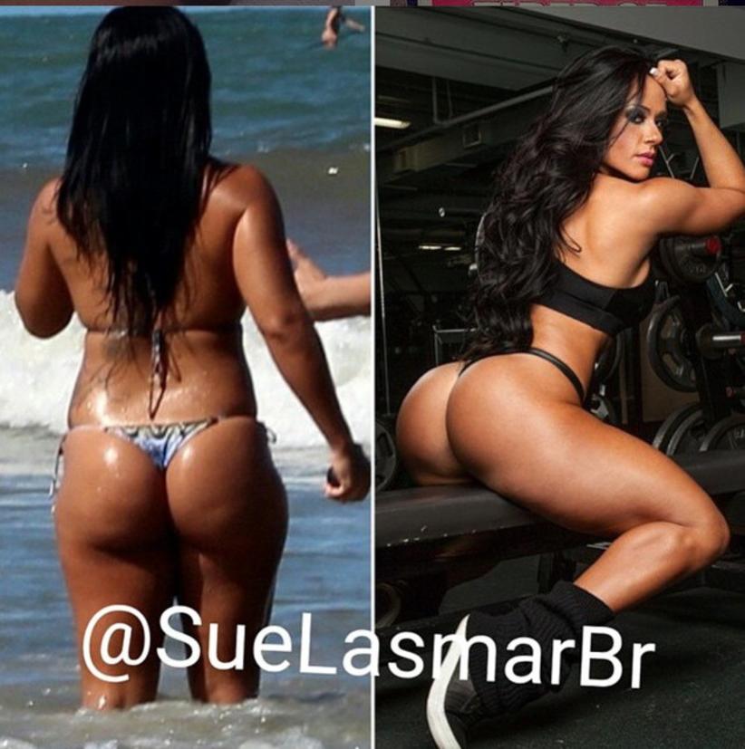 Quem vê Sue Lasmar saradíssima não imagina que antes a gata era bem diferente sem os gominhos e o bumbum avantajado.