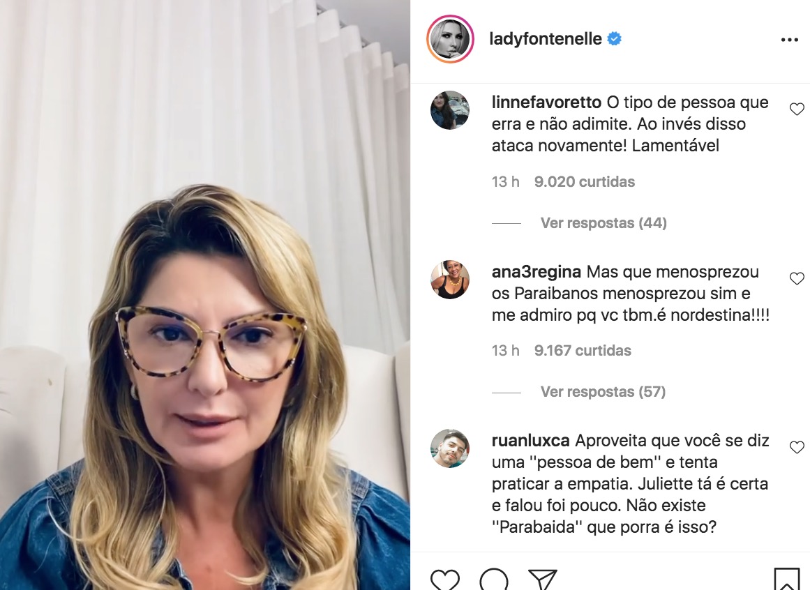 Fontenelle está sendo ainda mais atacada após gravar o vídeo. “Aproveita que você se diz uma ''pessoa de bem'' e tenta praticar a empatia. Juliette tá é certa e falou foi pouco. Não existe ''Paraibada'' que porr* é isso?”, disse uma seguidora.