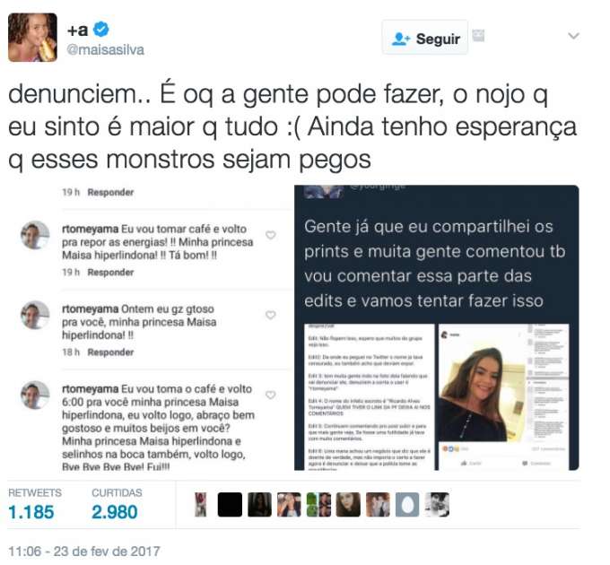 "Denunciem... É o que a gente pode fazer, o nojo que eu sinto é maior que tudo. Ainda tenho esperança que esses monstros sejam pegos", lamentou Maisa, que completou: "Pior coisa ler esses comentários."