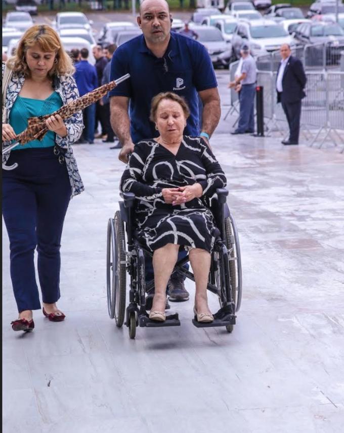 Aos 90 anos, Maria do Céu, mãe de Gugu Liberato, chegou em uma cadeira de rodas ao velório do filho, que ocorre na Assembleia Legislativa de São Paulo nesta quinta (28).