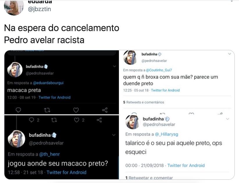 Pedro usou o Twitter diversas vezes para chamar internautas de "macaco preto", "duende preto", "macaca preta", gorila do deserto, entre outros termos de cunho racista.
