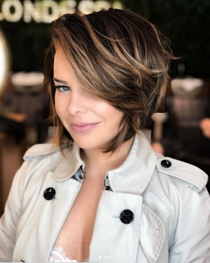 A apresentadora estava com as madeixas vermelhas na altura dos ombros e decidiu cortar ainda mais com uma espécie de bob de ponta, bem repicado. Agora, ela está morena com mechas.