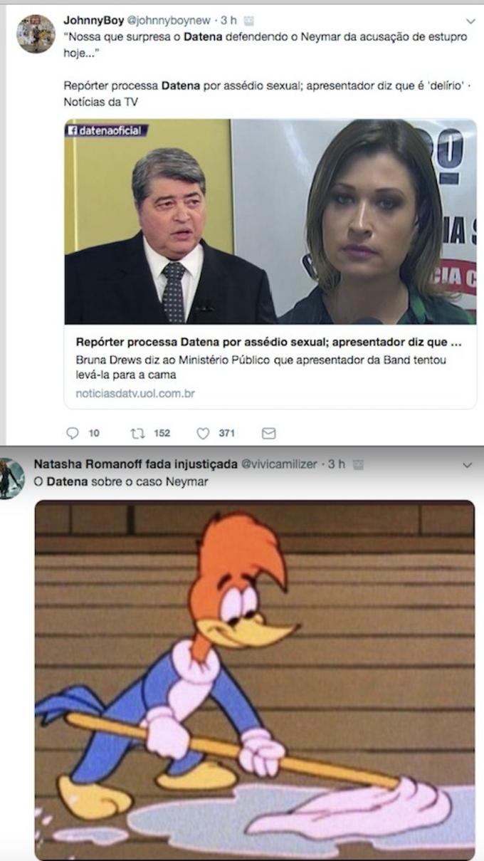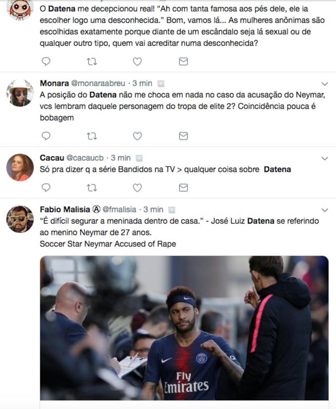Datena falou com o pai do jogador e durante a conversa, o apresentador, que responde a um processo por assédio sexual a uma repórter da mesma emissora em que trabalha, falou: “Seu filho é um menino, um jovenzinho de 27 anos de idade”. Em outro momento da da conversa, o apresentador falou que “é difícil você segurar a meninada dentro de casa. Mas quem tem uma figura pública do tamanho do Neymar, mundial, tem que se precaver”.